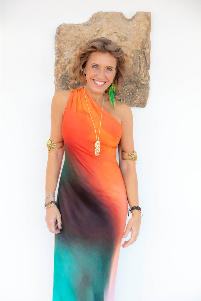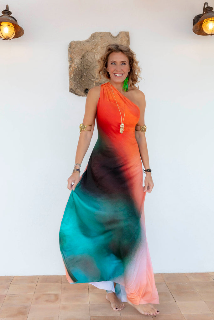 Its bold gradient print in shades of orange, coral, turquoise, and deep black evokes the fiery sunset and the depths of the sea. A vibrant explosion of color makes each piece one of a kind. A bold yet sophisticated choice for those who love to stand out with authenticity.