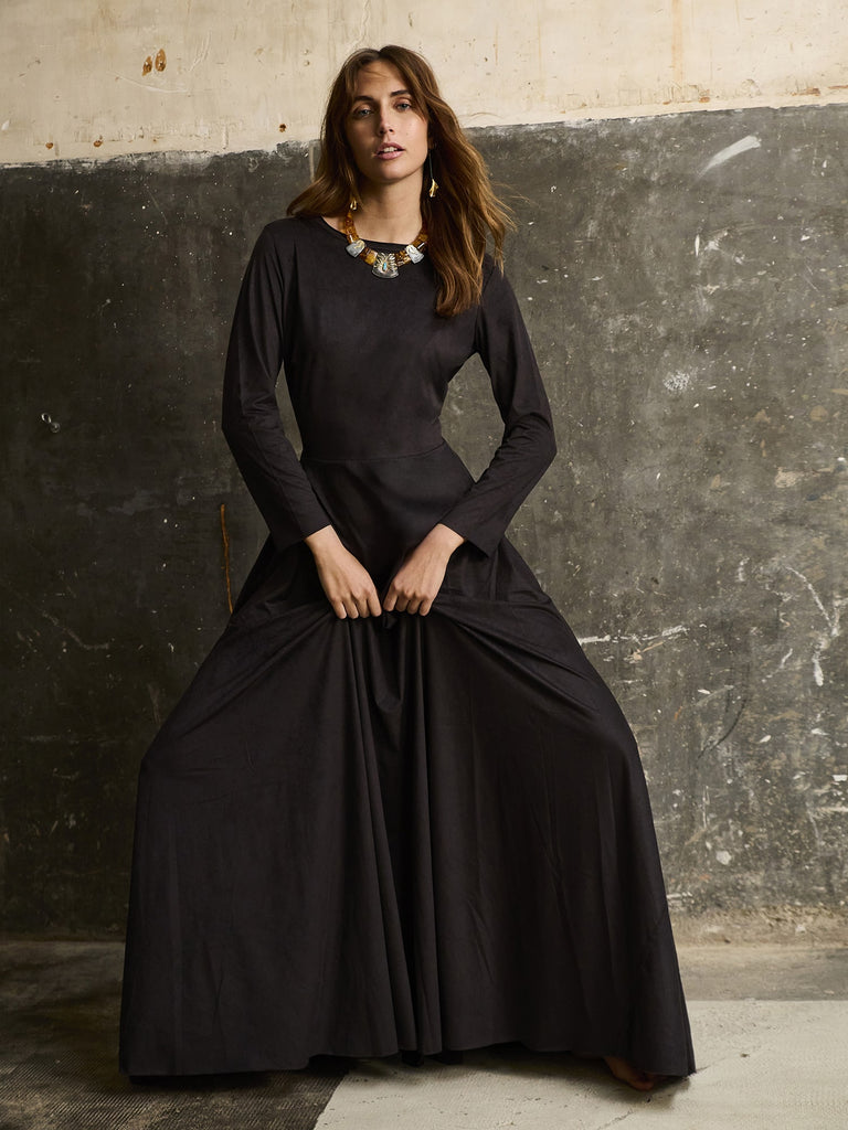 This black suede dress is the perfect choice to look elegant and sophisticated. With an original design featuring long sleeves, it's ideal for the in-between seasons. Additionally, its length makes it perfect for any occasion. Made with high-quality materials, this dress will provide comfort and style with every wear. Don't miss the opportunity to add this essential piece to your wardrobe.