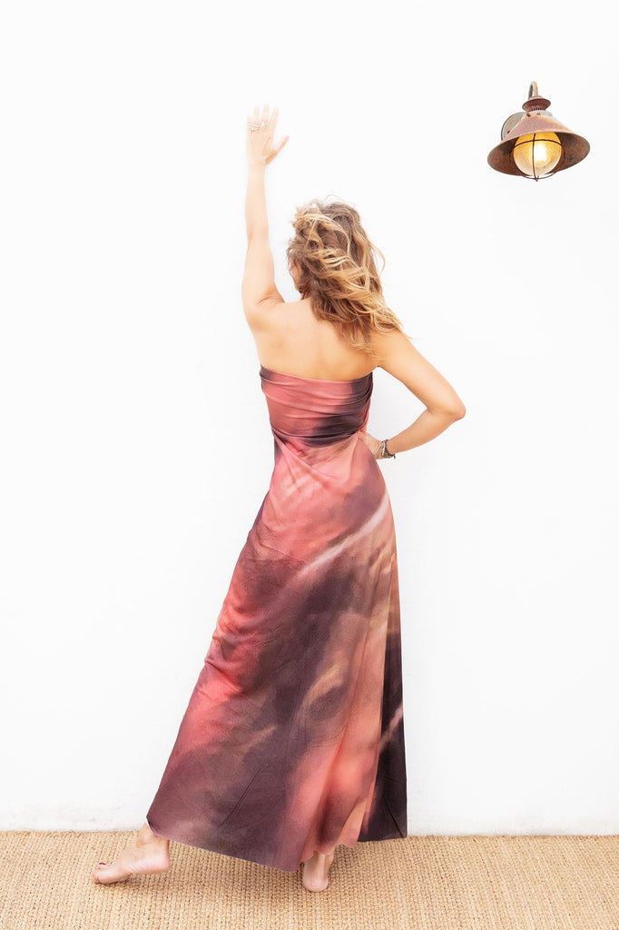 The Romantic Shakti dress with a strapless neckline is designed to stand out in any occasion. The earthy Shakti print evokes a connection with nature and primal energy, adding a dose of vitality to your look. Every detail of this print is imbued with meaning, reminding you of your inner strength and ability to face any challenge.