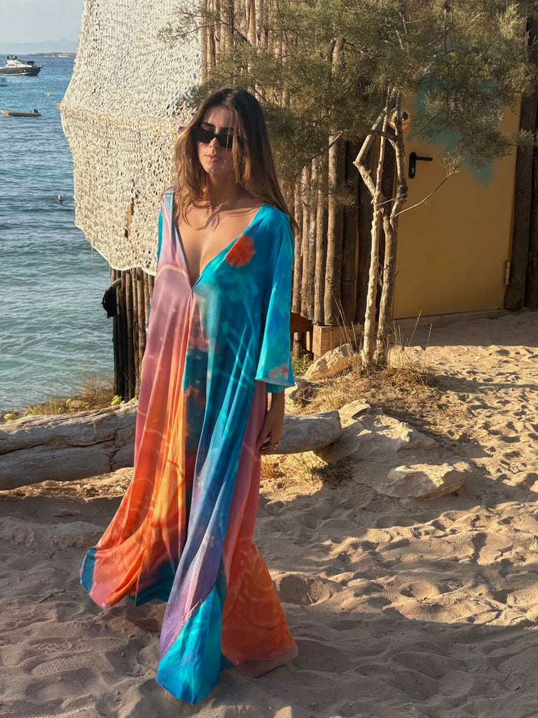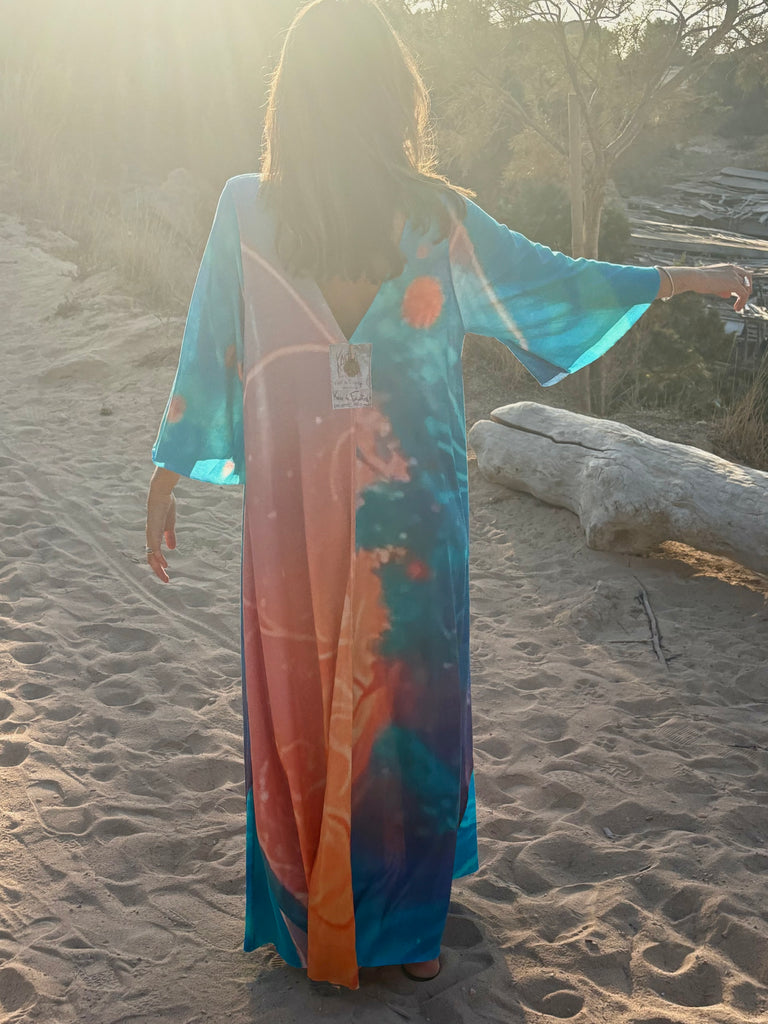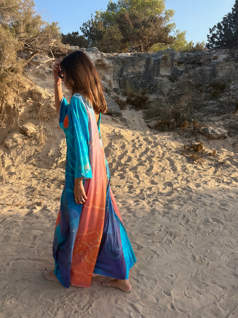 The Consecuence model with the amazing own drawing is an unic one. It is a model for dress fluidly and comfortably in any occasion both for a good lunch and a good dinner, day and night. Also with a nice sandal go to a cool restaurant on the beach. Its shiny colours make you feel the powerful sensation and high vibration to be happy. It is a magical dress!