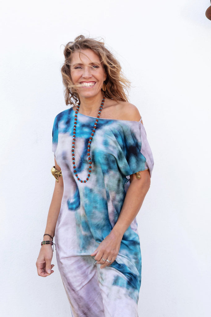 Si eres de las que prioriza la comodidad, este vestido es para ti. Te sentirás con total libertad, pero verás cómo con tu movimiento este vestido se adapta a tu figura. Su estampado Aretazul evoca los colores que se aprecian al contemplar el mar.